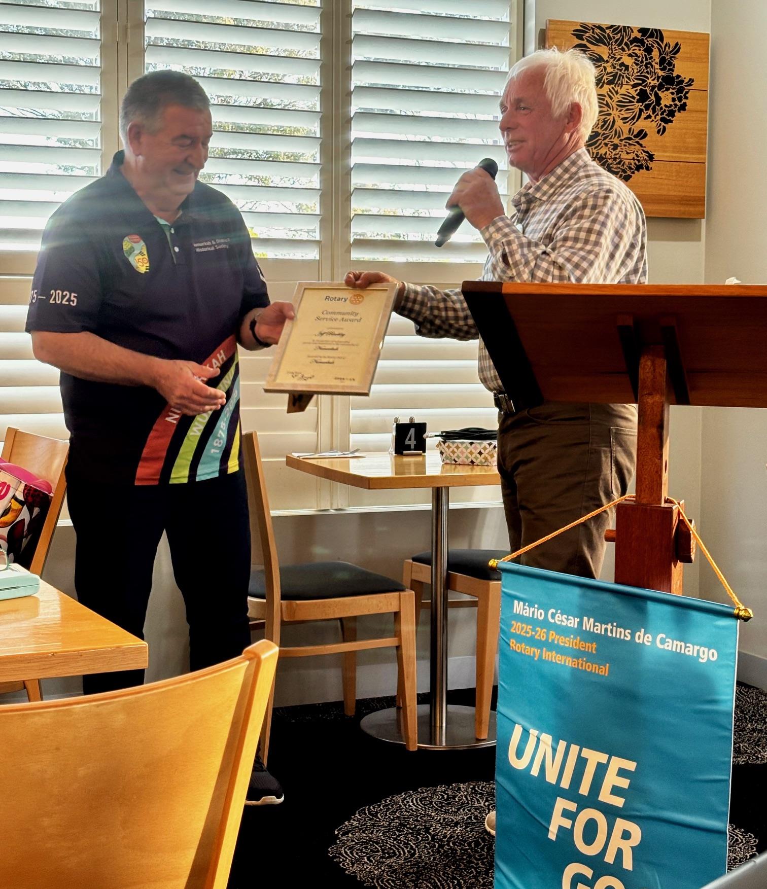 🏅 Community Service Award 2024: Honouring Jeff BlackleyAt the Rotary Club of Numurkah’s annual changeover dinner in June, the prestigious Col McPherson Community Service Award was presented to Jeff Blackley in recognition of his outstanding contributions to the local community. Although Jeff and his wife Judy were travelling at the time and unable to attend the ceremony in person, his impact was felt deeply by all in attendance. Jeff’s connection to Numurkah runs deep. His grandparents were among the town’s early settlers in the 1800s, operating a lolly shop and working as a baker and carver. His father continued the family’s legacy of service, employed at the Numurkah Butter Factory. Jeff himself served as Principal of Numurkah Primary School before relocating to Shepparton, but his heart has remained firmly rooted in the town. In recent years, Jeff has been the driving force behind the planning and coordination of Numurkah’s 150-year celebration, set for 2025. The committee, formed two years ago, has worked tirelessly to develop a program that honours the town’s rich history and brings together both past and present residents. Jeff has always emphasized that the recognition should be shared among the entire committee, whose collective efforts have made the vision a reality. The celebration was designed as a “back to the town” initiative, inviting former residents to reconnect while engaging current locals in rediscovering their heritage. The committee proudly believes this goal has been achieved, sparking renewed interest in Numurkah’s history and fostering a sense of pride across generations. Rotary played a key role in supporting the lead-up to the festivities, including the opening of a time capsule. Alongside the Numurkah Historical Society, Rotary helped coordinate a series of events that showcased the power of community collaboration. Volunteers from all walks of life gave their time generously, contributing to a vibrant and inclusive celebration. School groups were actively involved, visiting the local museum and participating in historical projects. The intergenerational engagement was a highlight, with both young and old coming together to share stories and learn from one another. Jeff even brought along a quiz featuring items from every decade since the 1880s, sparking curiosity and conversation among attendees. Jeff Blackley’s leadership and dedication exemplify the spirit of community service. His work has not only honoured Numurkah’s past but laid the foundation for a future built on connection, pride, and shared history